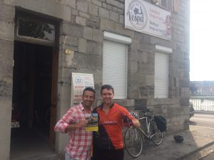 First, we needed to collect B’s bike. We were renting from a place called Vespa Loisirs in the centre of town. The owner, Sebastian, was a very friendly an helpful fella. He was loving the Bath to Rome trip! Check out the photo below. He kitted B out with a cool looking bike and we went on our way. Merci Sebastian for your help…top man!