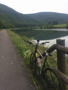 The route was excellent. The road surface was smooth tarmac and the views were amazing. We cycled along the river and through a couple of towns. It seemed like we had turned back on ourselves but the signs said differently. Great plumes of smoke stretched across the sky from two huge power stations. They didn’t quite fit in with the wonderful scenery (see VIDEO 2) so we were happy when they disappeared from sight!
