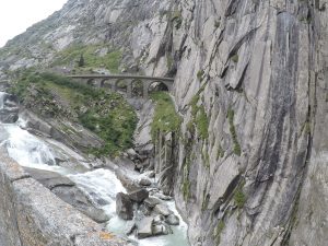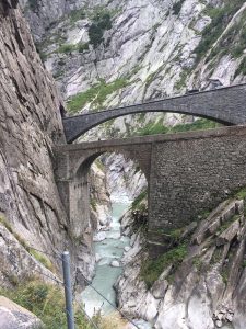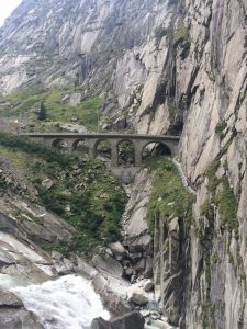 When we reached Andermatt we decided to take a detour. I’d spotted something on the map that looked interesting. We hopped back on our bikes and went to check it out. The place I’d spotted was called Devil’s Bridge. It was a huge rocky gorge with a series of bridges crossing a wild river. We were glad we found it! Have a look below.