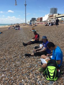 I met the guys at Lancing train station at 11:15am and we set off towards Brighton on Cycle Route 2. We were in good spirits and cruised along chatting away. We made it to Brighton beach where we sat down and had lunch. Simon and Owen tried out the fish ‘n’ chips but I wasn’t keen for a massive meal….watching my figure don’t you know.